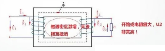 電流互感器在正常工作時,它的一次磁勢與二次磁勢是彼此均衡的。一旦二次側開路,二次電流等于零,一次線圈的電動勢堅持不變,一次電流全部成為勵磁電流,這將招致鐵芯中磁通量Φ急劇上升,這個急劇上升磁通量或許招致鐵芯磁飽或許或許在二次側感應出較高的電壓。