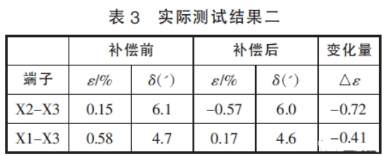 在表2和表3的實測效果中,補償前后相位差改動不大,標明本文中筆者舉薦的輔佐電壓互感器規劃結構漏抗小,對相位差的影響可以忽略不計,與剖析效果一起。