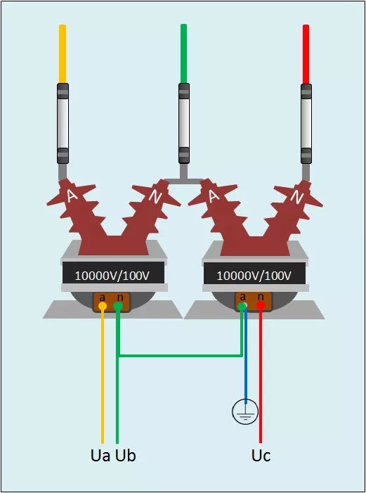 兩個單相電壓互感器的V/V形接線,可測量線電壓,但不能測相電壓,它遍及應用在20kV以下中性點不接地或經消弧線圖接地的電網中。